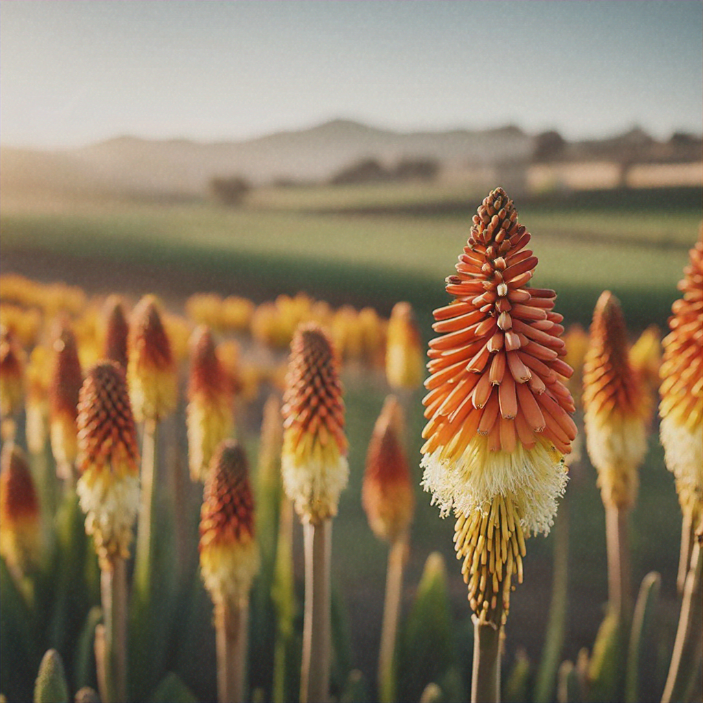 Kniphofia, a genus of perennial flowering plants, is renowned for its striking, torch-like inflorescences that range in color from fiery reds and oranges to yellow and cream. These plants thrive in the Mediterranean-like climate of California, offering not only a visually stunning addition to gardens and landscapes but also a valuable crop for the region’s agricultural sector.